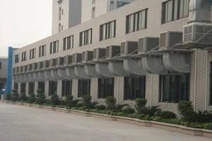其原理是將自來水輸送到冷風機,利用機身蓄水盤內水的溫度比室內空氣的溫度低,從空氣吸取熱量,來進行降溫,而溫度升高的水通過冷水循環機構,經過降溫蓄水罐和低溫冷水機冷卻后,降低到合適的溫度,就可以送到冷風機再次進行降溫。因此,只需要少量的循環水,低溫冷水機耗費少量的電能就可以大幅提高冷風降溫裝置的降溫效果。