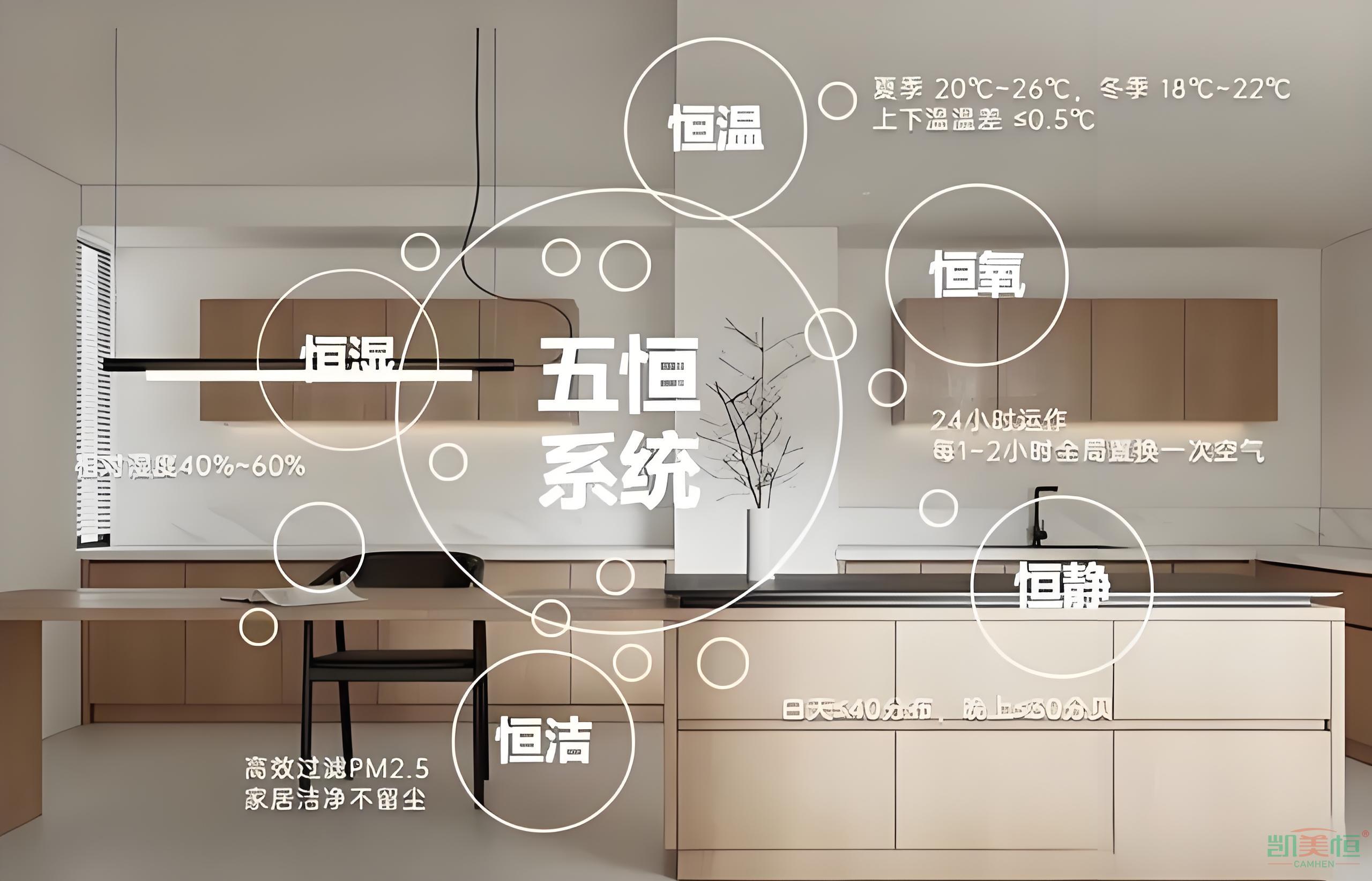 指的是通過毛細管網輻射系統和高效可熱回收的新風系統控制室內的溫、濕度和空氣的潔凈度,核心理念“以節能為基礎,以智慧控制為核心,以舒適健康為目標”,進而使房間內24 小時內保持恒溫、恒濕、恒氧、恒潔、恒靜的效果。